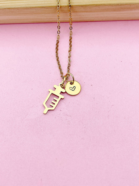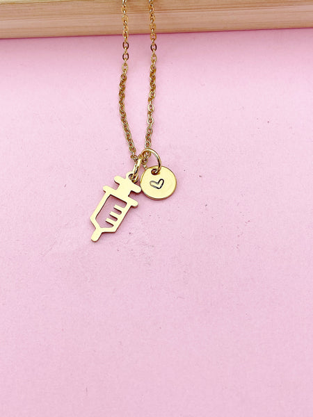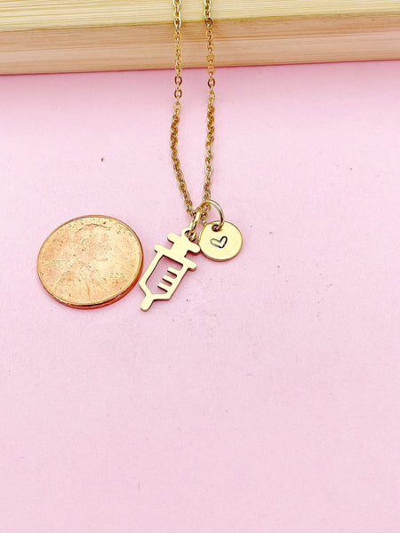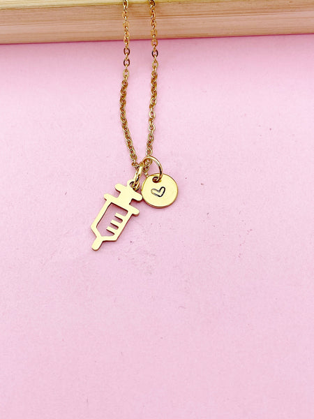 This is a stainless-steel Gold Color Injection Syringe charm with hand stamped initial charm on a stainless-steel chain.