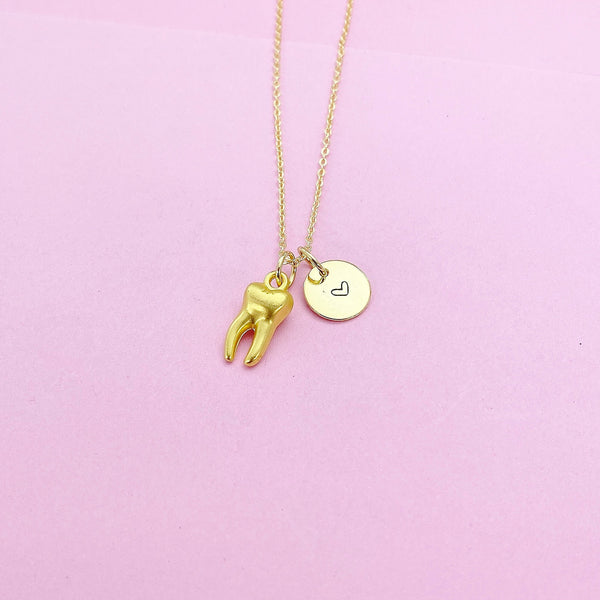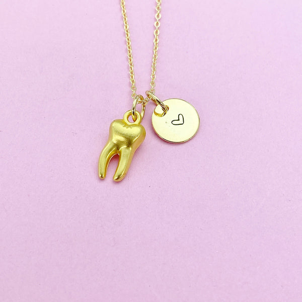 This is gold tone tooth charm with hand stamped initial charm on brass or stainless-steel chain.