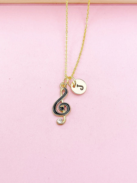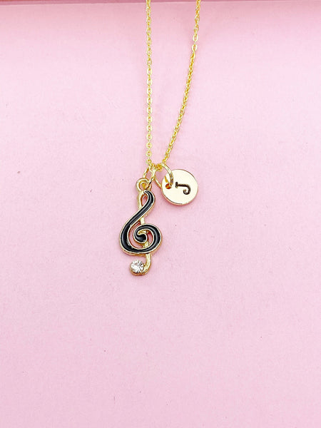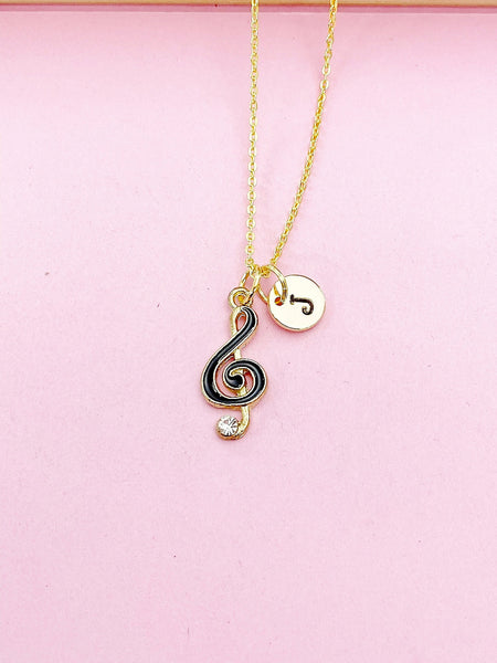 This is gold tone Treble Clef Note charm with hand stamped initial charm on brass or stainless-steel chain.