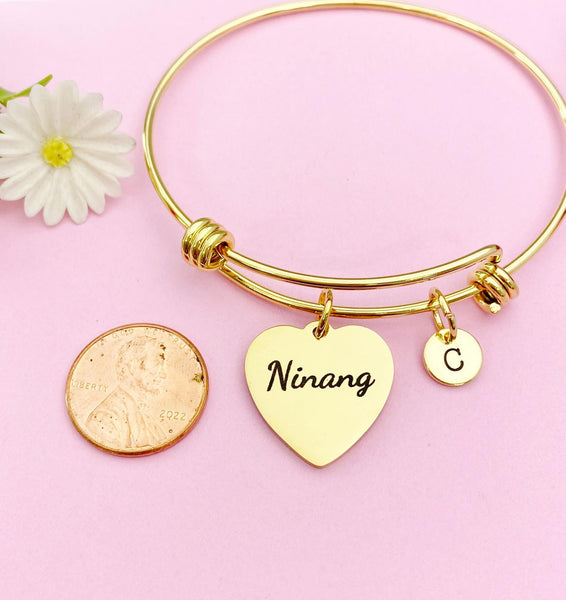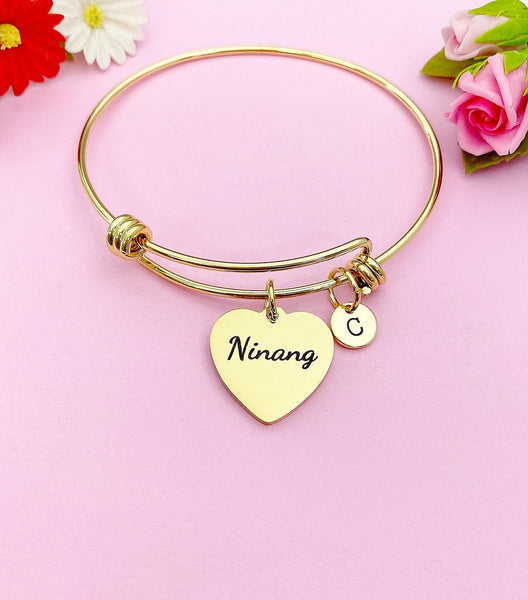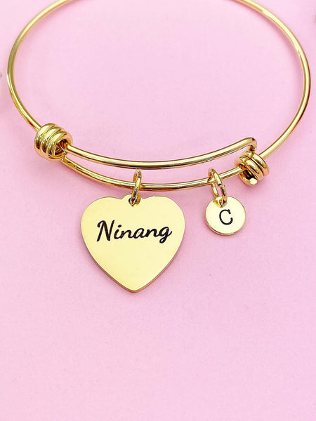 This is a gold-tone Ninang charm with hand stamped initial charm on stainless steel bracelet.
