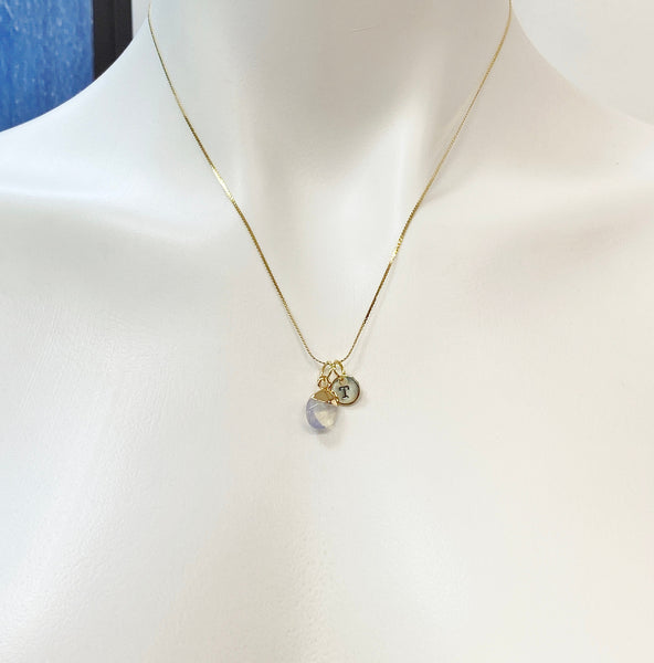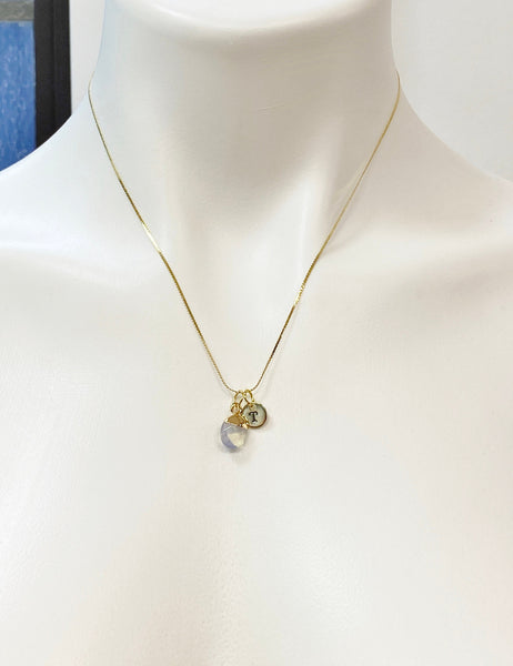 This is a silver-tone opalite charm with hand stamped initial charm on stainless steel 18 inches chain.