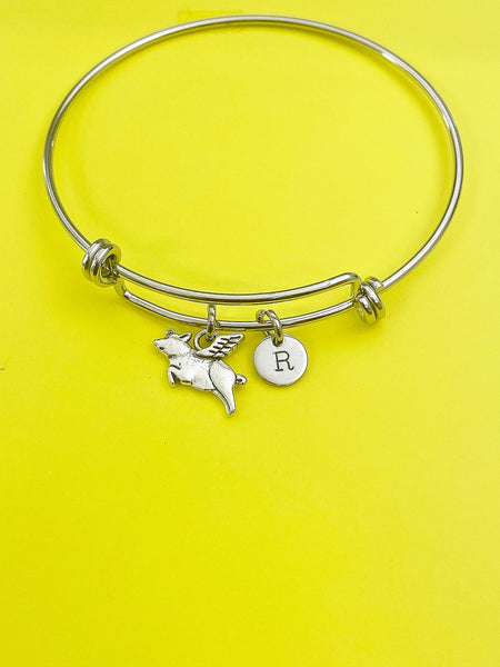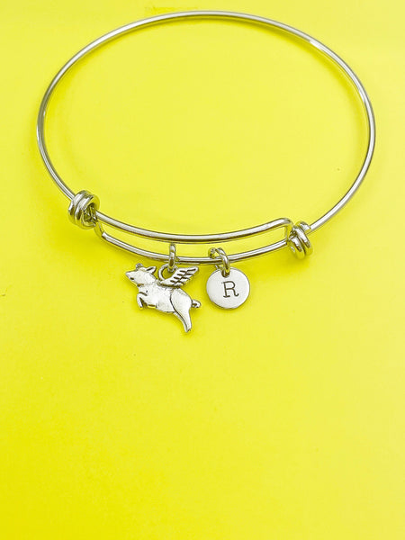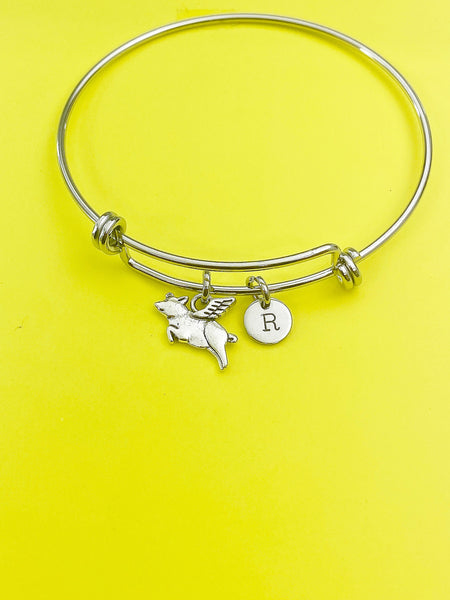 This is a gold or silver -tone flying pig charm with hand stamped initial charm on stainless steel bracelet bangle.