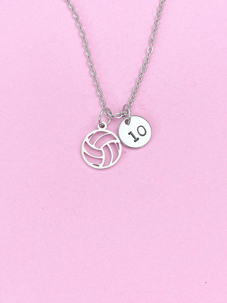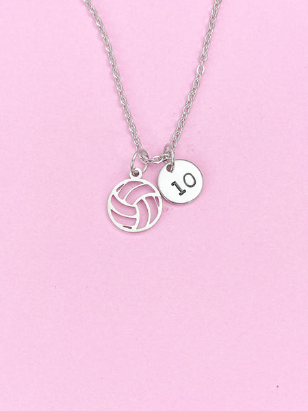 This is a gold or silver-tone volleyball charm with hand stamped number charm on stainless steel 18 inches chain.