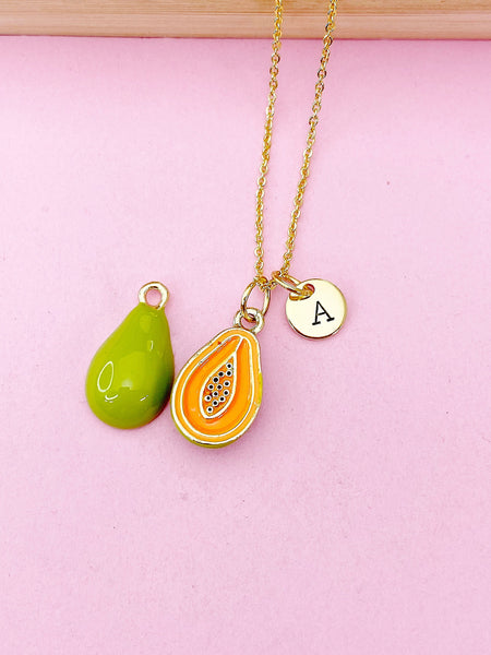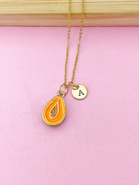 This is a gold -tone Papaya charm with hand stamped initial charm on brass/stainless steel 18 inches chain.