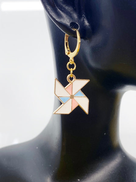 Gold Pinwheel Charm Earrings, Pink Blue White Pinwheel Earrings, Windmill Charm Earrings, Summer Earrings, N2683
