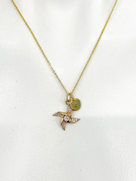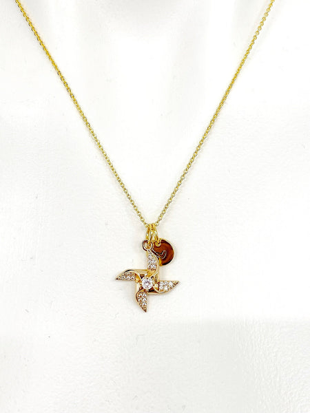 This is gold tone pinwheel charm with hand stamped initial charm on brass or stainless steel 18 inches chain.