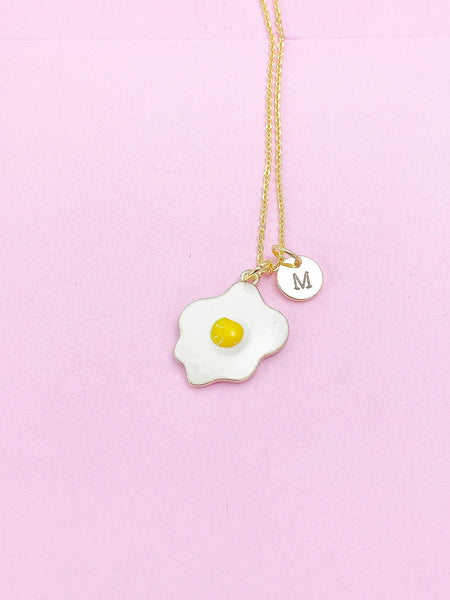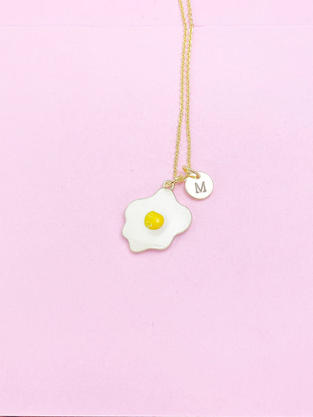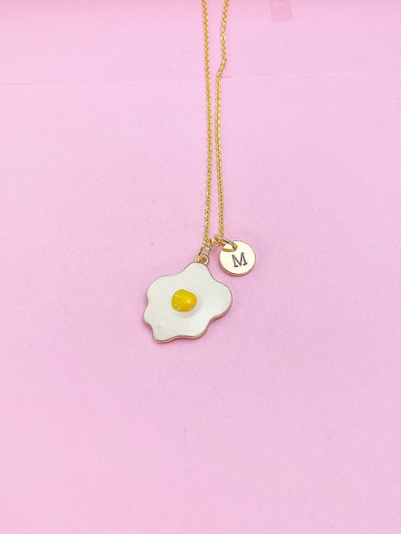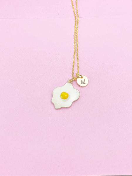 This is gold tone Poached Egg charm with hand stamped initial charm on brass or stainless-steel chain.