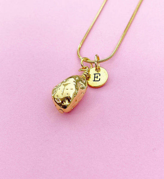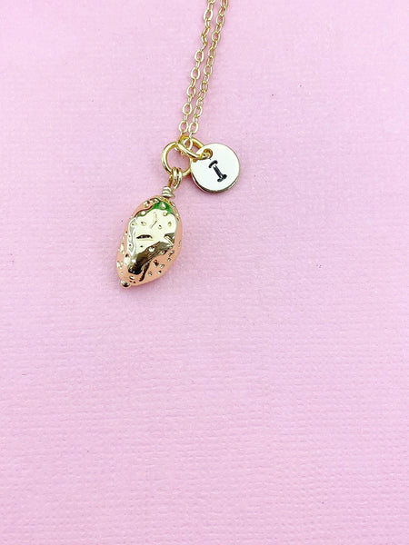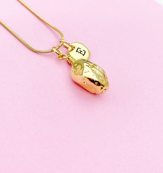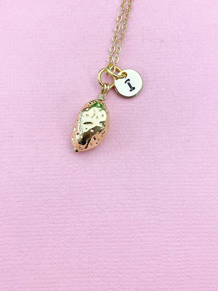This is gold tone potato charm with hand stamped initial charm on brass or stainless steel 18 inches chain.