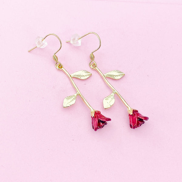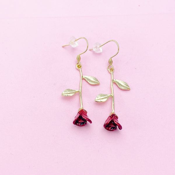 These are gold-toned hand painted dark red on a rose tip on stainless steel ear hooks.