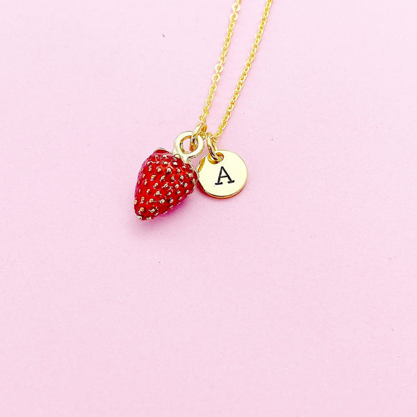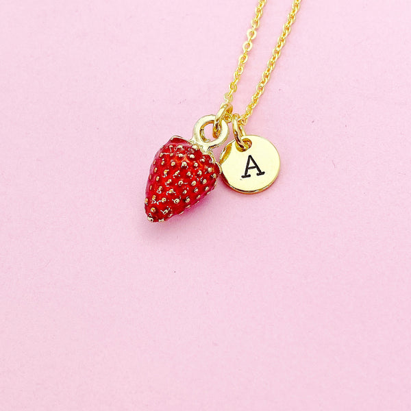 This is gold tone Strawberry charm with hand stamped initial charm on brass or stainless-steel chain.