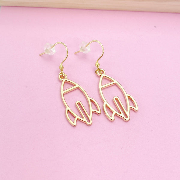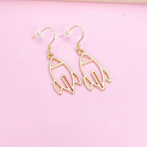 These are gold-toned rocket charms with stainless steel ear hooks.