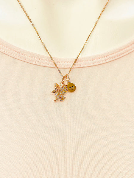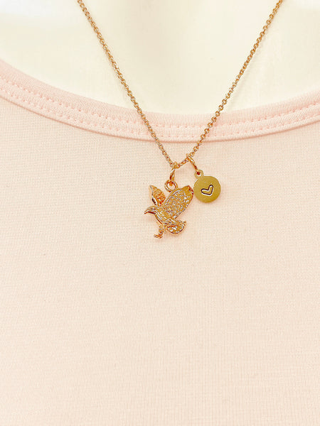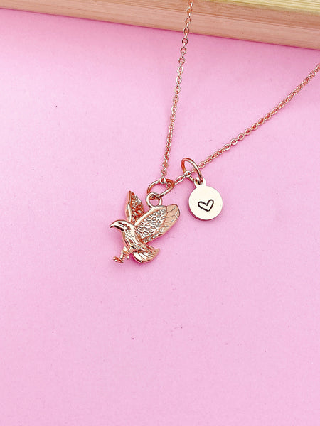 This is rose gold tone eagle charm with hand stamped initial charm on brass/stainless steel 18 inches chain.