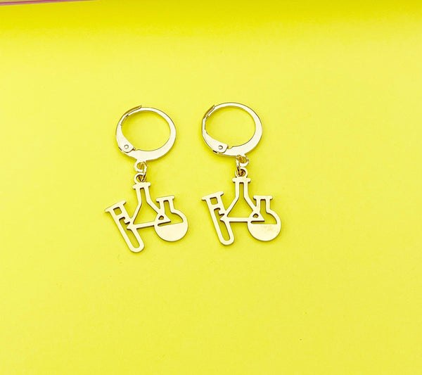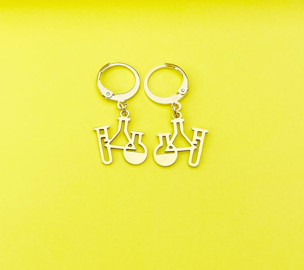 These are gold-toned Science Laboratory Beaker charm on stainless steel ear hooks.
