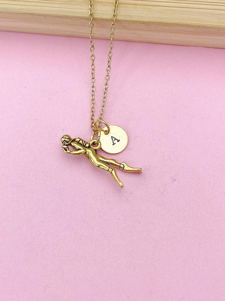 This is a gold -tone scuba charm with hand stamped initial charm on stainless steel 18 inches chain.