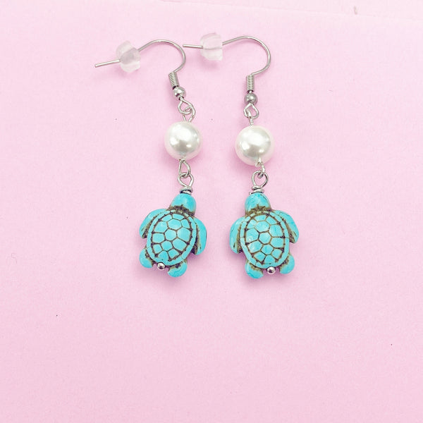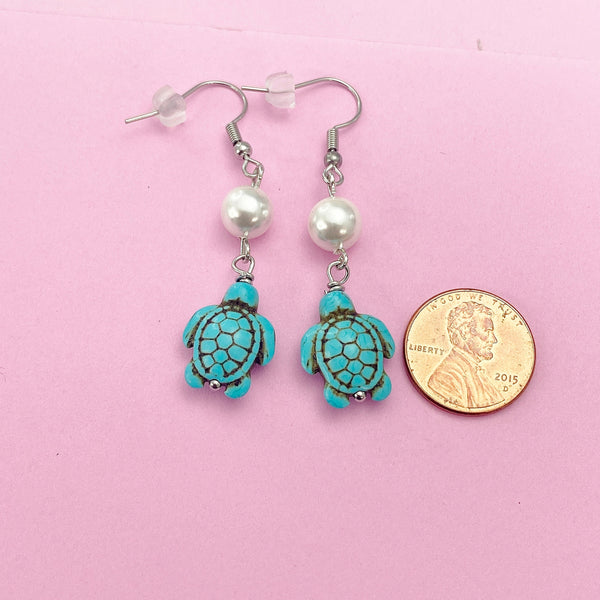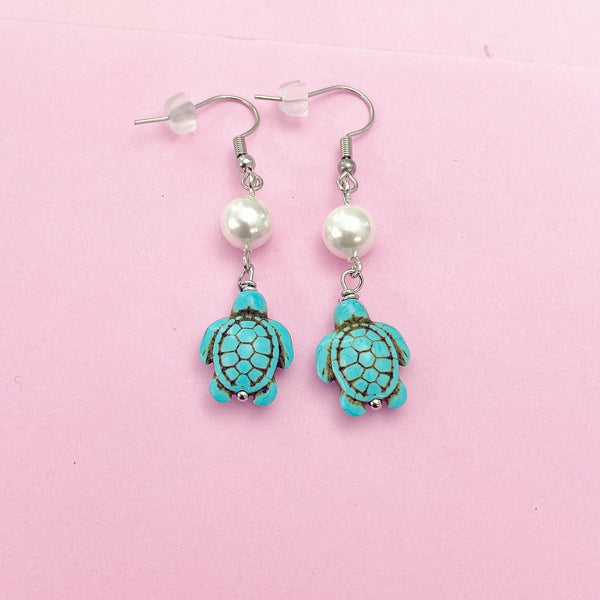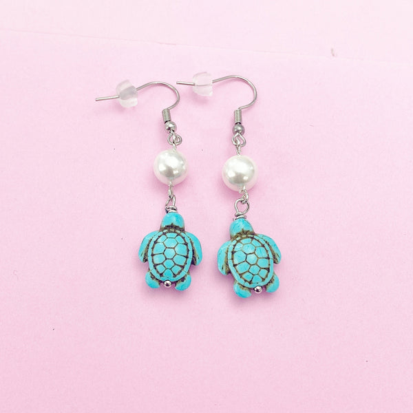 These are gold-toned turtle and shell pearl charm on stainless steel ear hooks.