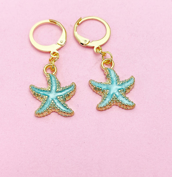 These are gold-toned Starfish charms with stainless steel ear hooks.