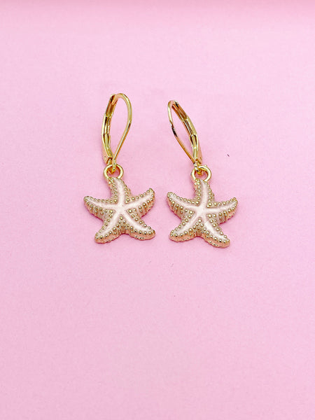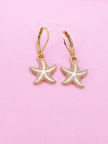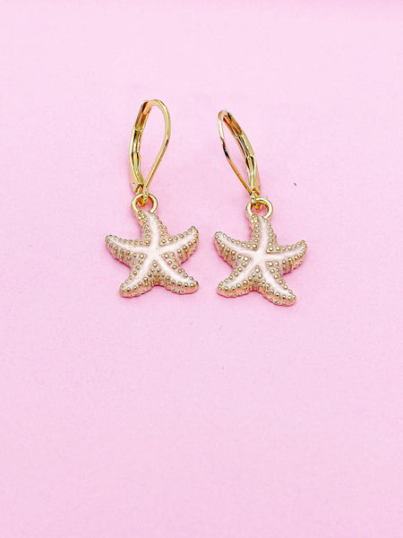 These are gold-toned starfish charms with stainless steel ear hooks.