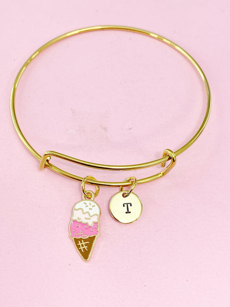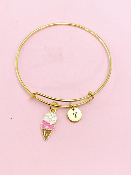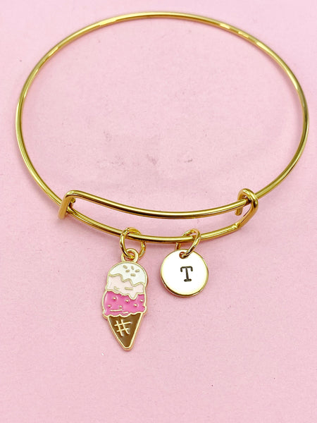 This is a gold-tone ice cream charm with hand stamped initial charm on stainless steel bracelet.