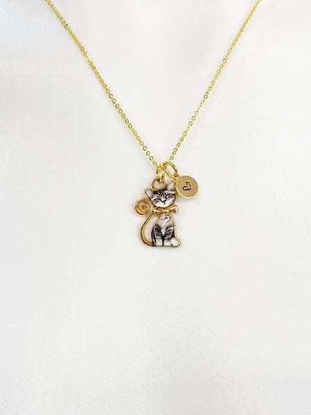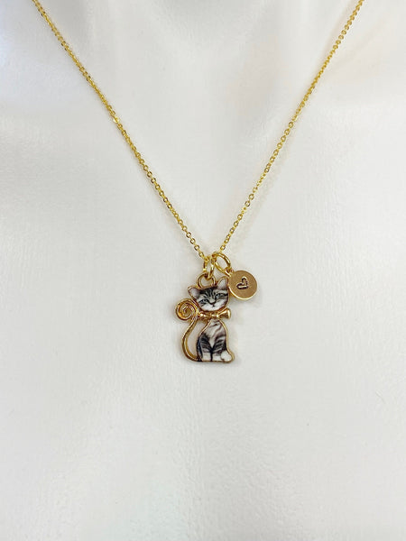 This is a gold tone cat charm with hand stamped initial charm on gold plate brass/stainless steel 18 inches chain.