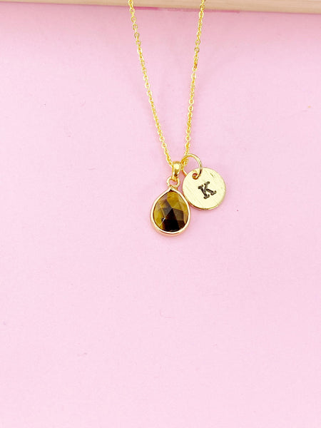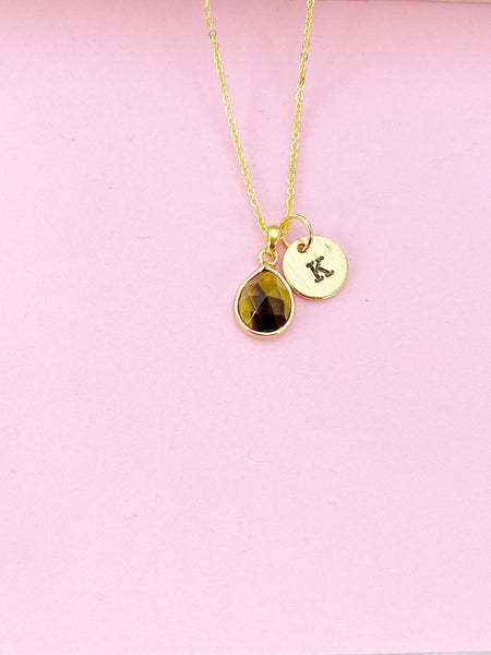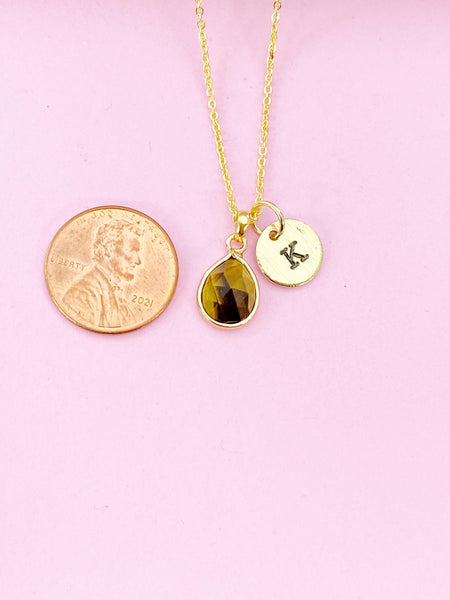 This is gold tone Natural Tiger Eye charm with hand stamped initial charm on brass or stainless-steel chain.