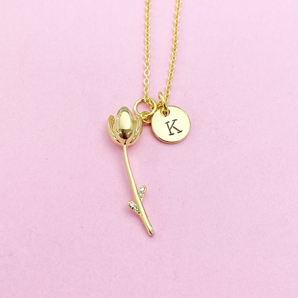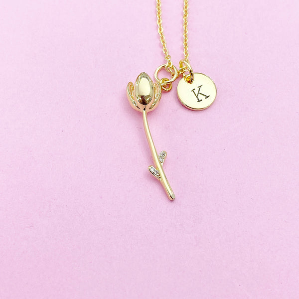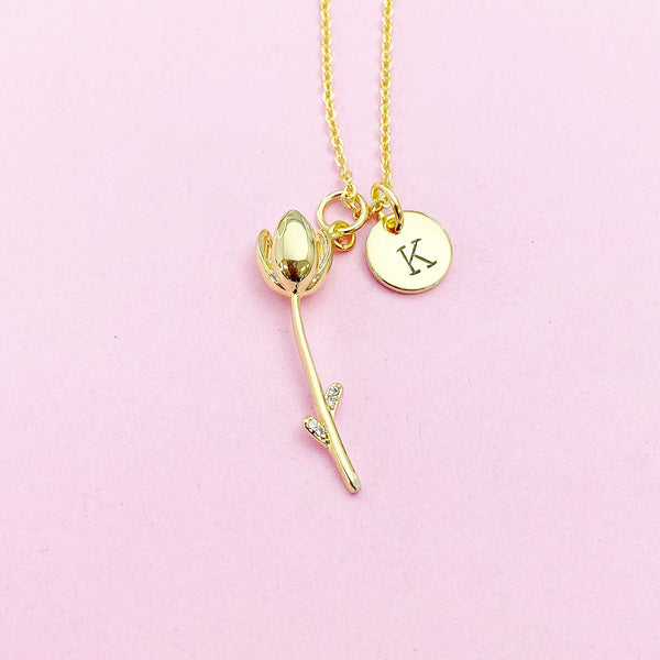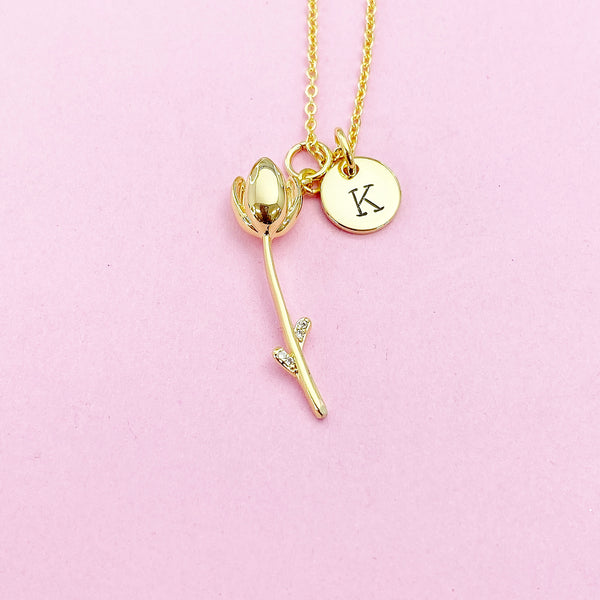 This is gold tone tulip charm with hand stamped initial charm on brass or stainless-steel chain.