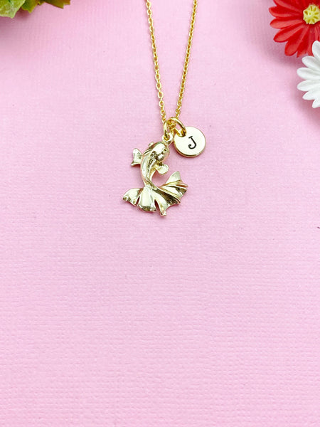 This is gold tone goldfish charm with hand stamped initial charm on brass or stainless-steel chain.
