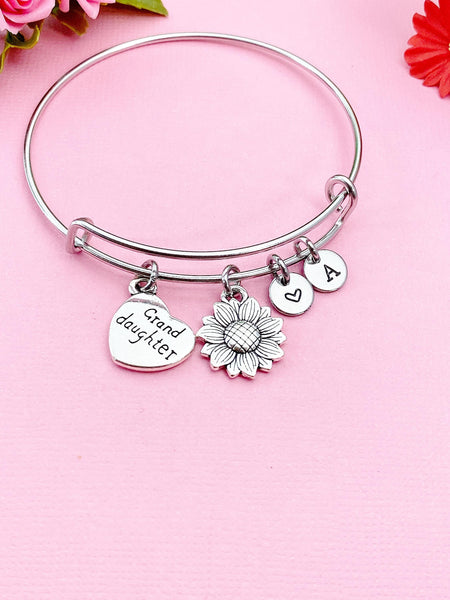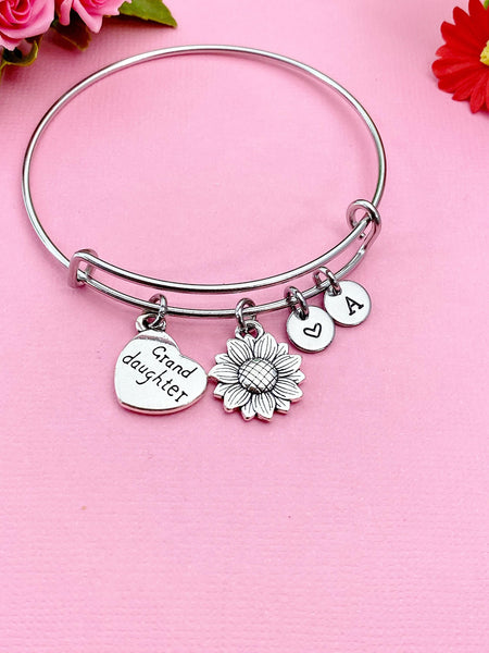 This is a silver-tone granddaughter charm and sunflower charm with hands stamped heart and initial charm on Tarnish Resistant stainless steel bracelet.