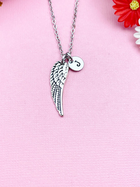 This is a silver-tone Guardian Angel Wing charm with hand stamped initial charm on stainless steel necklace.