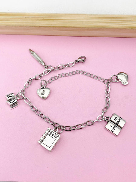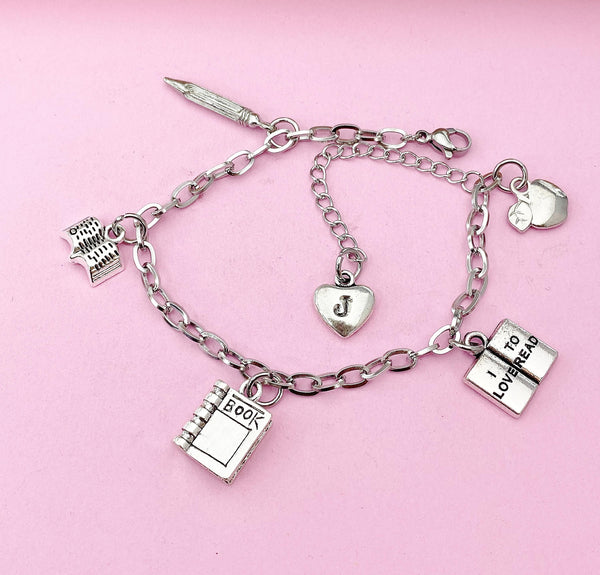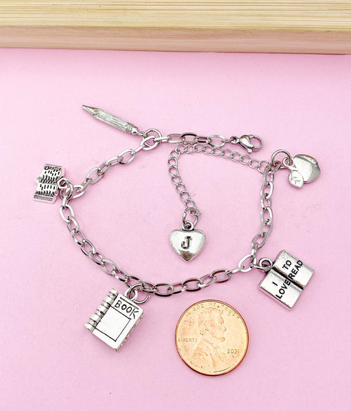 This is a silver-tone alloy I love to read, apple, textbook, open-book, pencil charm with hand stamped initial charm on tarnish resistant stainless steel chain.