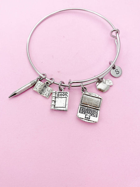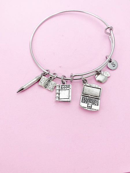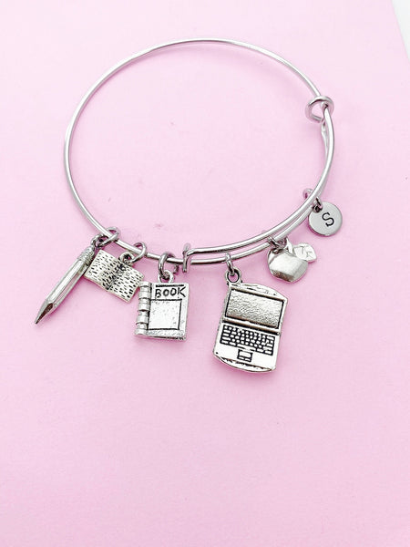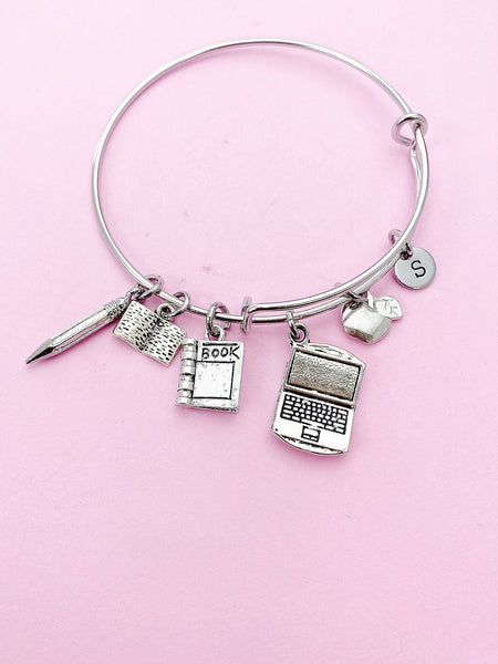 This is a silver-tone computer, apple, textbook, book, pencil charm with hand stamped initial charm on stainless steel bracelet.
