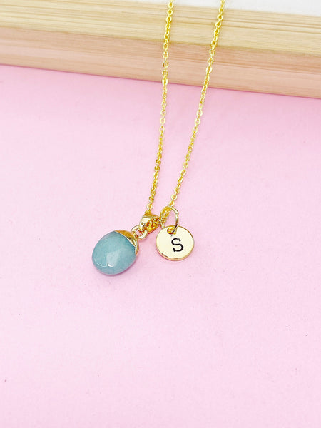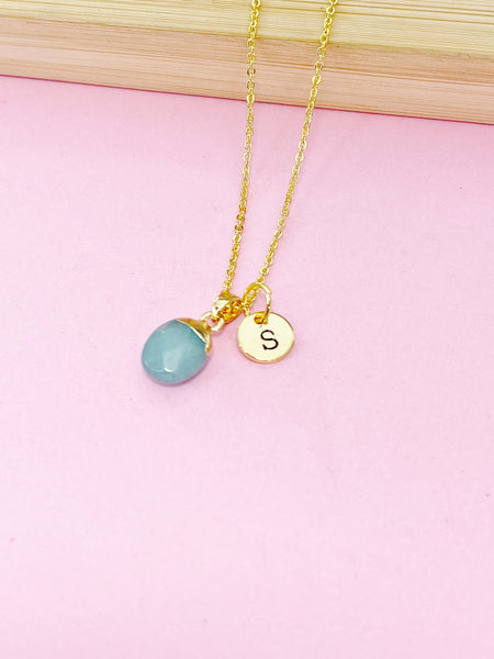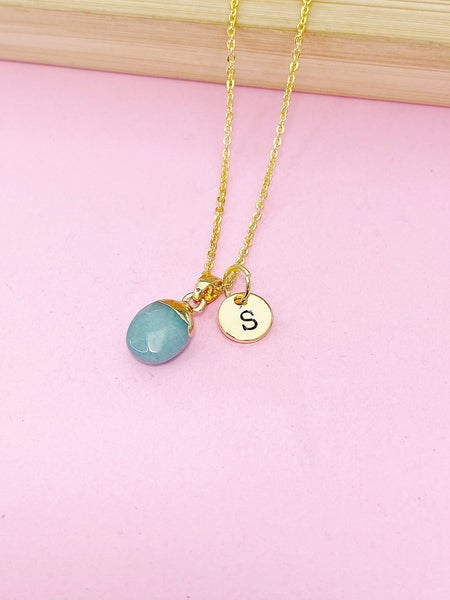 This is gold tone Green Jade charm with hand stamped initial charm on brass or stainless-steel chain.