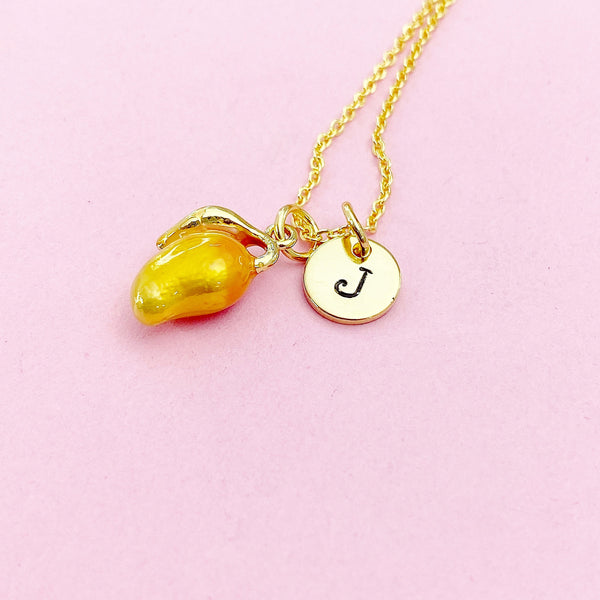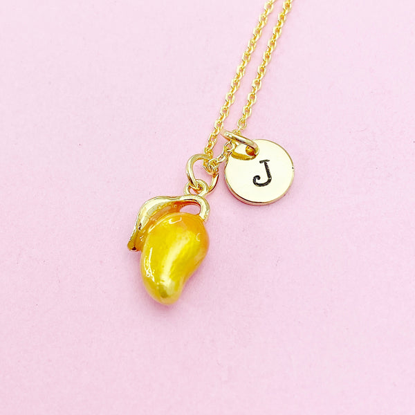 This is gold tone fruit mangoes charm with hand stamped initial charm on brass or stainless-steel chain.