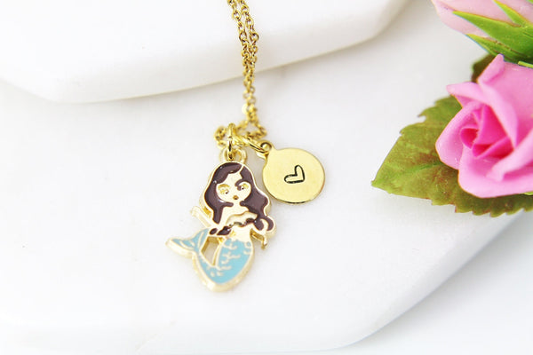 This is gold tone mermaid charm with hand stamped initial charm on brass or stainless-steel chain.