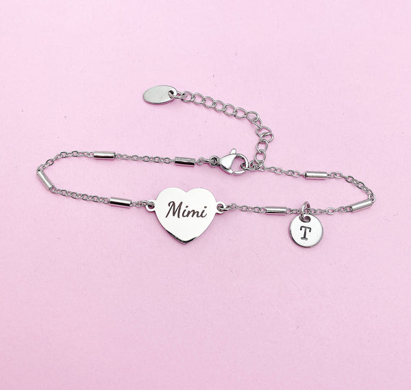 This is an engraving Mimi on stainless steel with hand stamp Initial charm on stainless-steel bracelet.