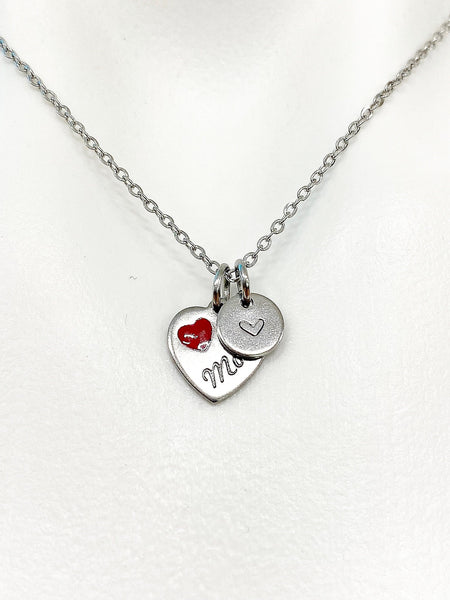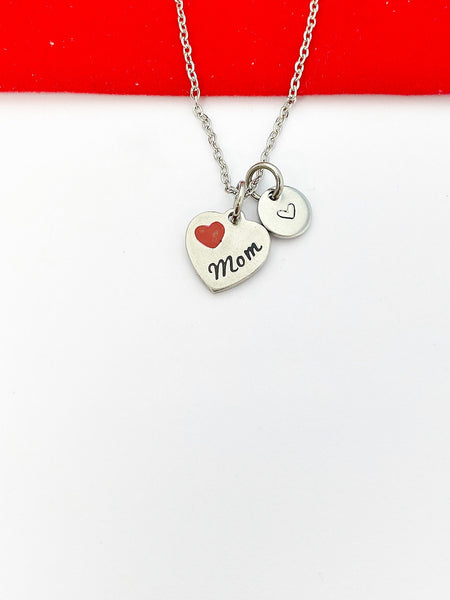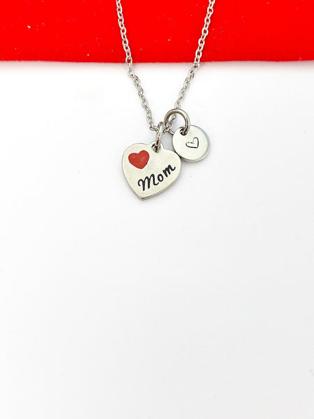 This is a stainless-steel Mom charm with hand stamped initial charm on a stainless-steel chain.