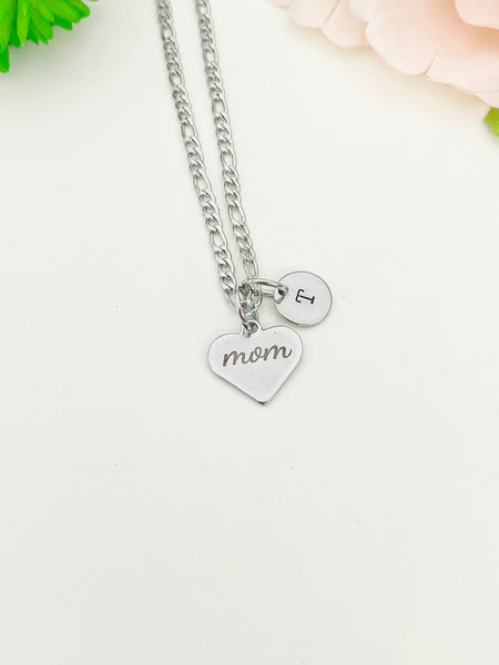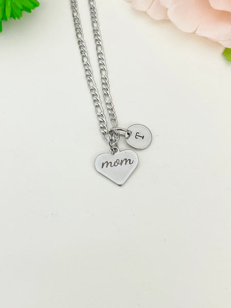 This is an engraving Mom on stainless-steel or aluminum with hand stamped initial charm on 18 inches chain.