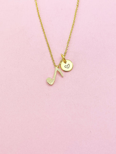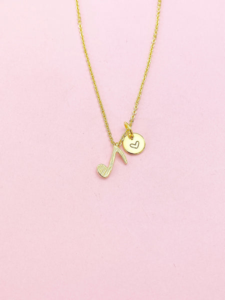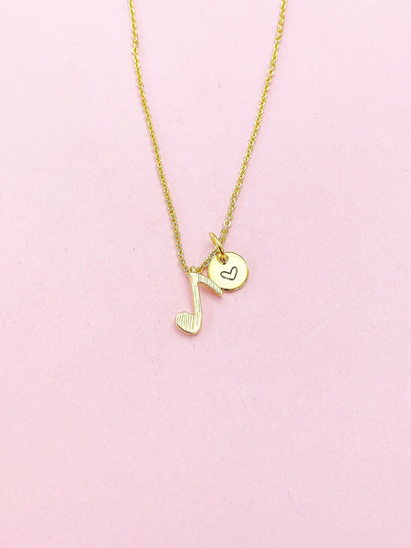 This is a gold -tone music note charm with hand stamped initial charm on brass/stainless steel 18 inches chain.