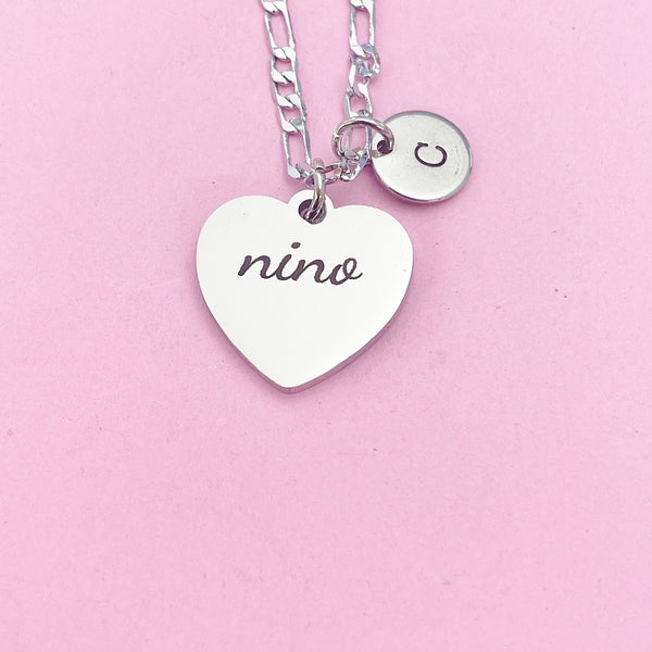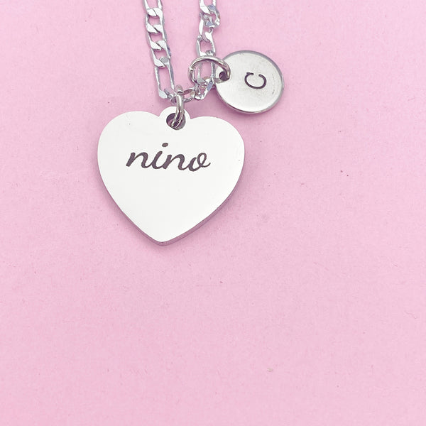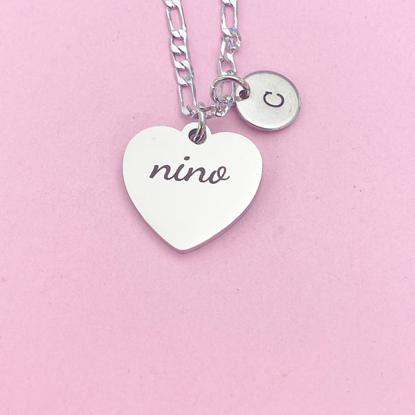 This is an engraving Nino on stainless-steel with hand stamped initial charm on 18 inches chain.