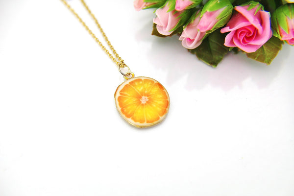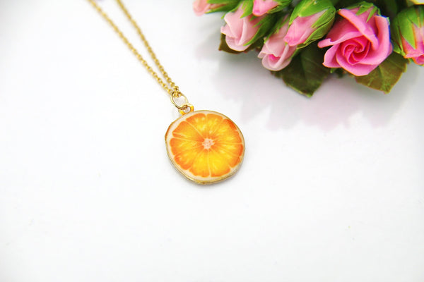 This is a gold-tone orange slice charm on a chain. You able to choose as a necklace, bracelet bangle or key chain.