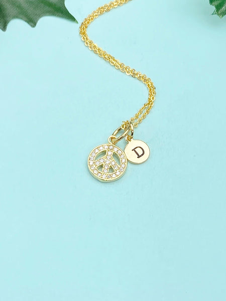 This is a gold-tone peace charm with hand stamped initial charm on necklace.