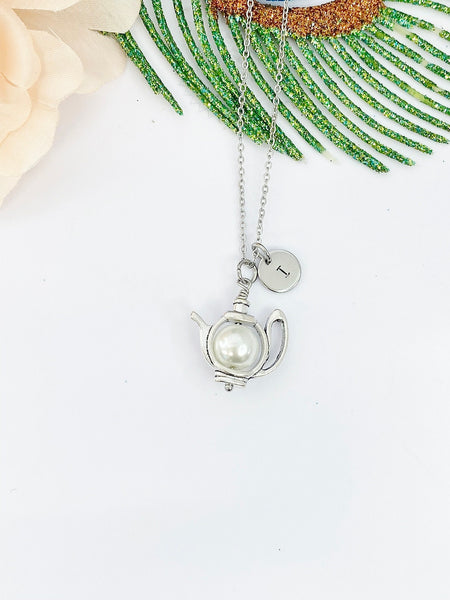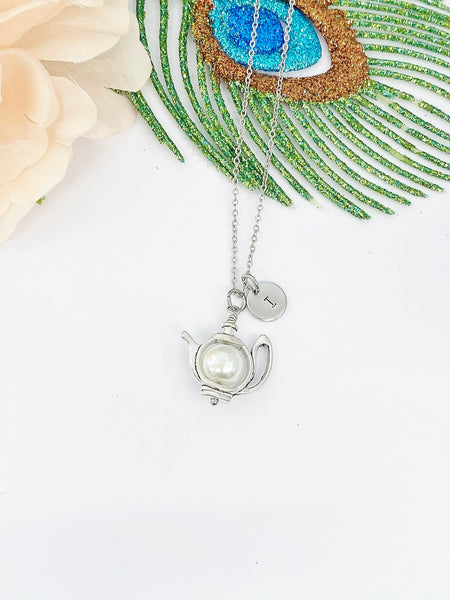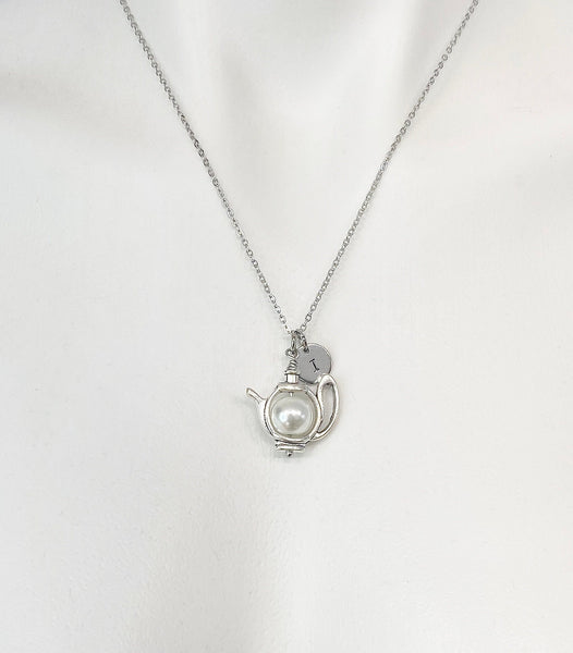This is a silver -tone Pearl Teapot charm with hand stamped initial charm on 18 inches chain or bangle.