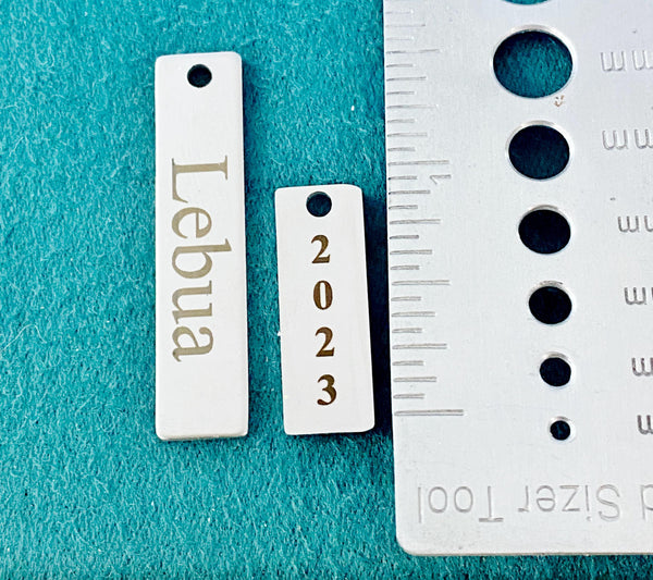 ♥ Letter /Years, engraving on 304 Stainless Steel Pendants, Blank Stamping Tags, Rectangle, Stainless Steel Color, Size: about 9mm wide, 25mm long, 1.8mm thick or if long letters we will use Tarnish Resistant 304 Stainless Steel Pendants, Laser Cut, Stamping Blank Tag, Rectangle, Stainless Steel Color, Size: about 10mm wide, 41mm long, 1.4mm thick