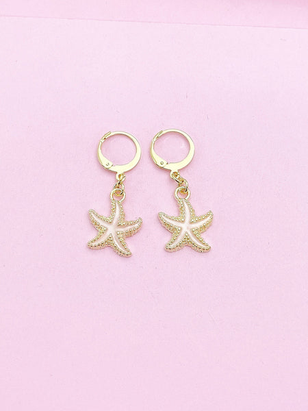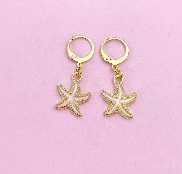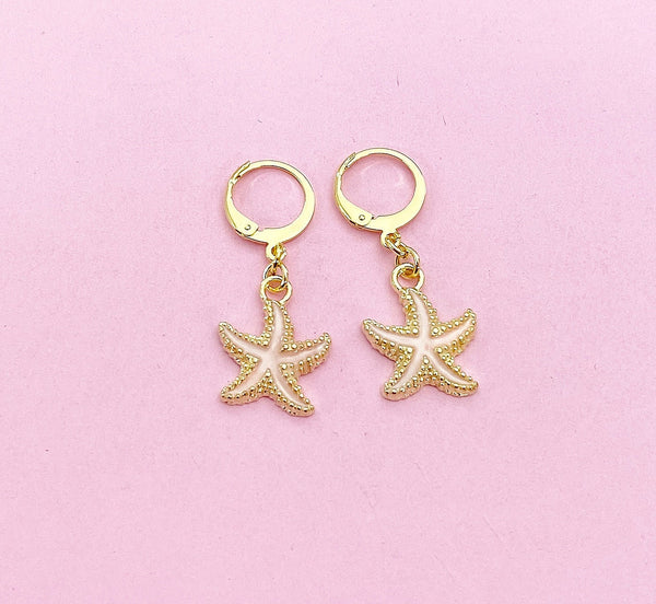 These are gold-toned starfish charms with stainless steel ear hooks.