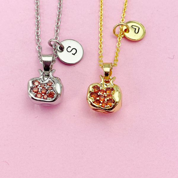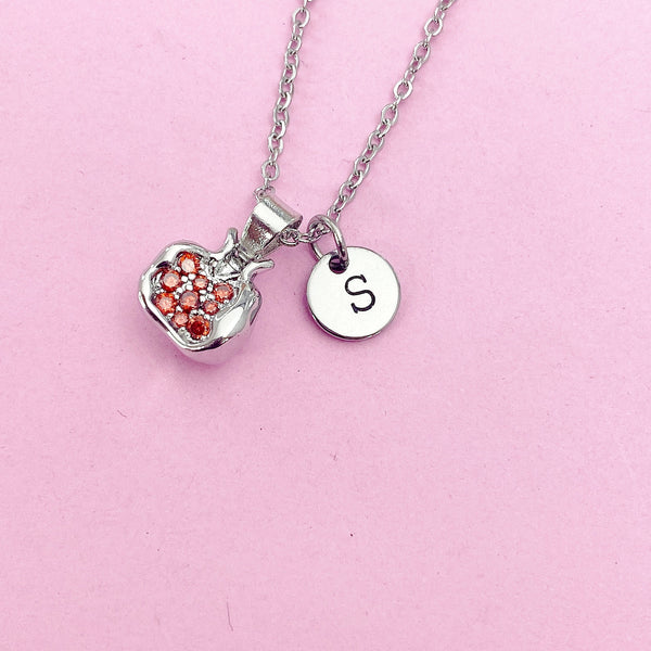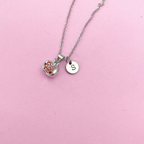 This is silver tone Pomegranate charm with hand stamped initial charm on brass or stainless-steel chain.