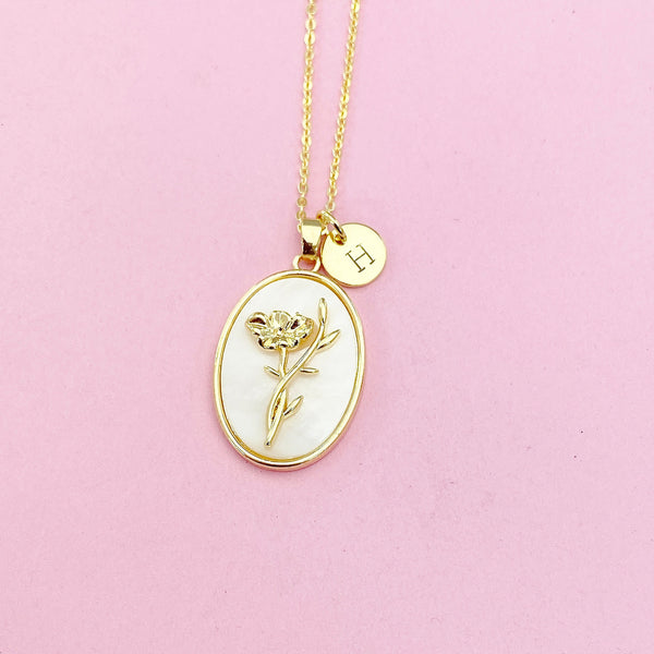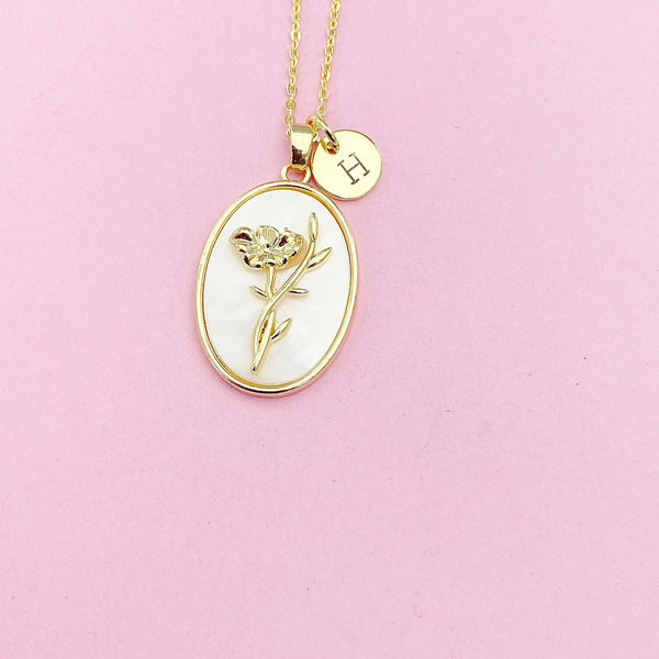This is a gold -tone Poppy August Birth Flower charm with hand stamped initial charm on brass/stainless steel 18 inches chain.