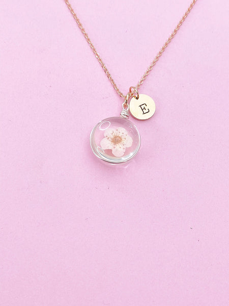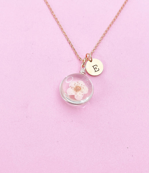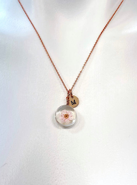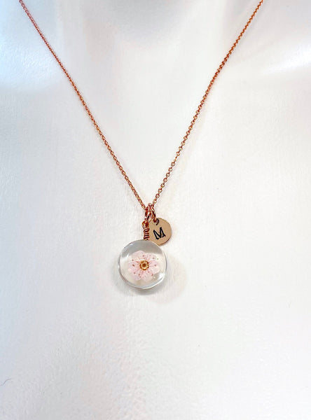 This is a rose gold-tone flower charm with hand stamped initial charm on stainless steel or brass chain.