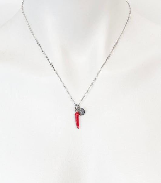 This is a silver-tone Red Chili charm with hand stamped initial charm on 18 inches chain or bangle.