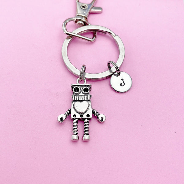 This is a silver-tone Robot charm with hand stamped initial charm on keyring.