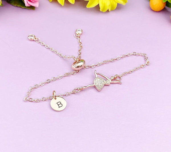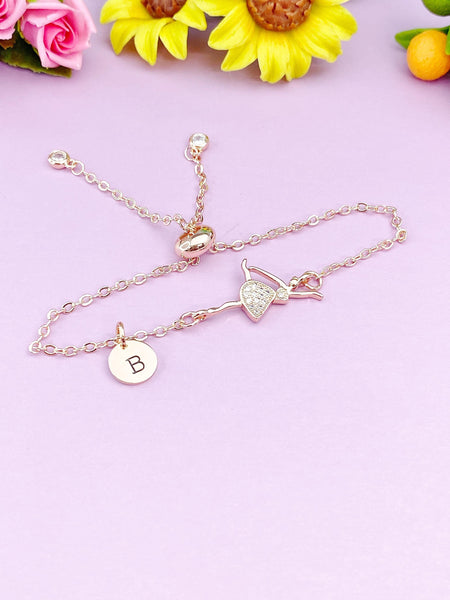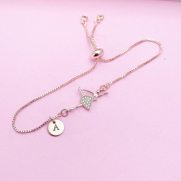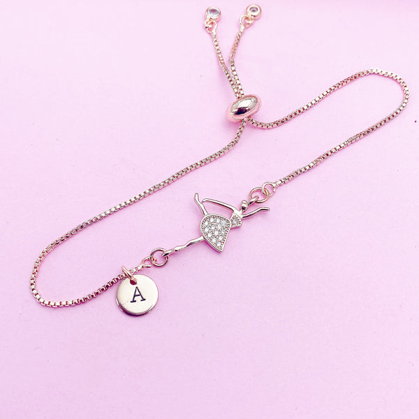 This is gold, rose gold or silver tone cubic zirconia ballet charm with hand stamped initial charm on brass/stainless steel bracelet chain.