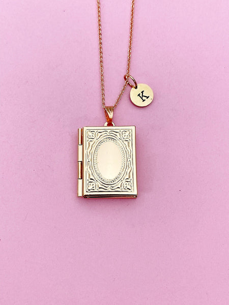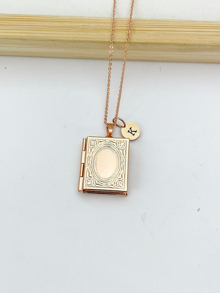This is an engraving initial on rose gold tone book locket charm on 18 inches brass or stainless-steel chain. *We do not provide the service of adding photos to lockets.*